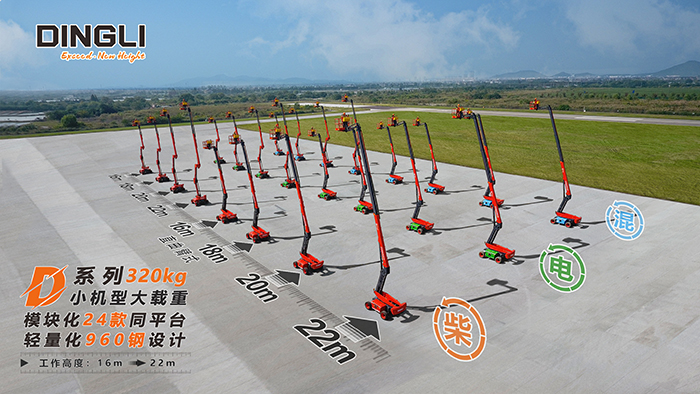 近期,在原有16~22米臂式基础上,usdt游戏网推出升级款小机型大载重D系列模块臂式,全系列全行程大载重达到320kg,共24款,柴、电、混动(各8款)同平台,包含4款曲臂,4款直臂。